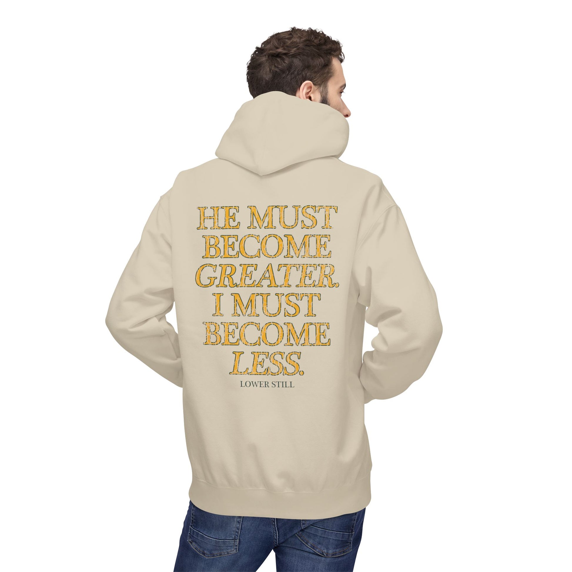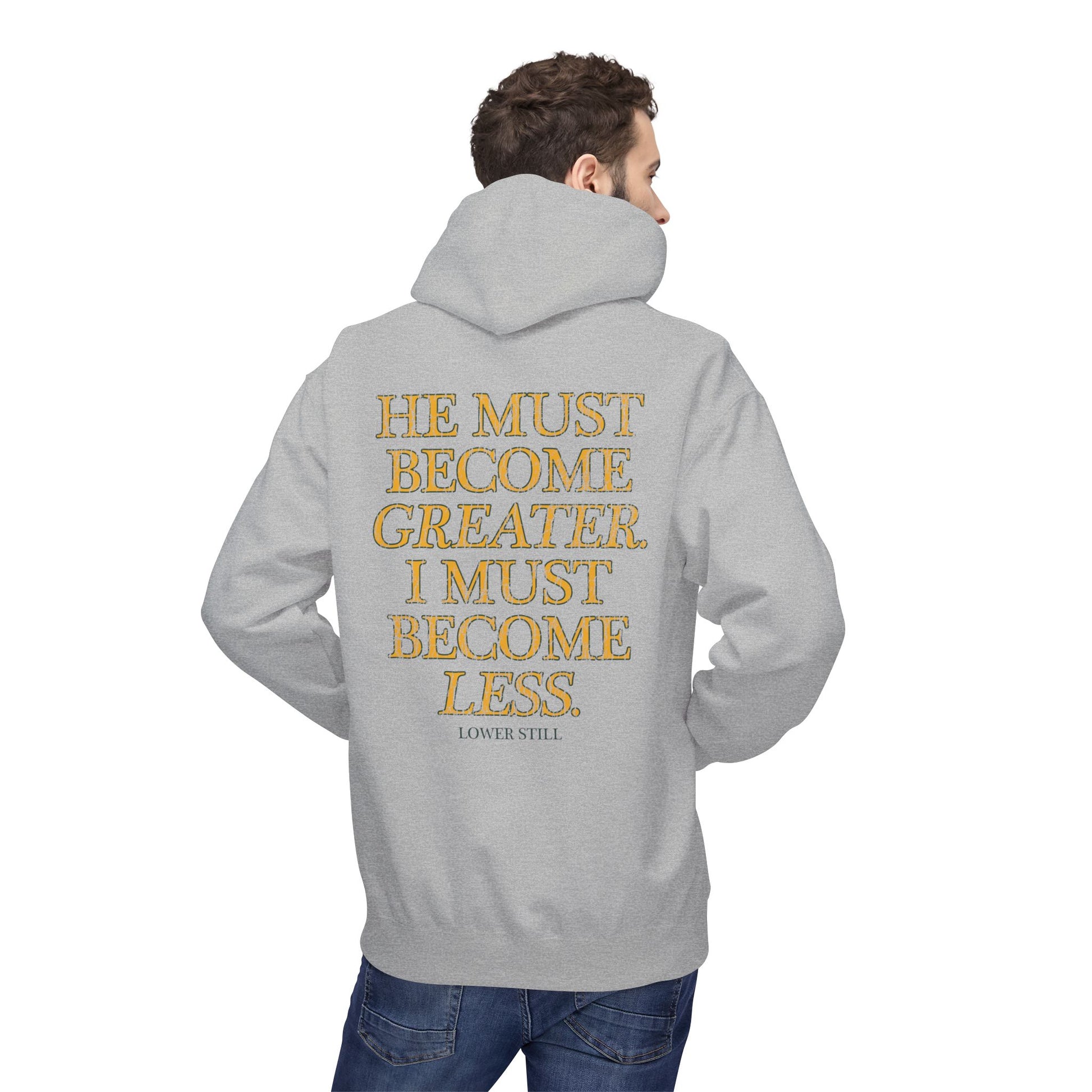 The Greater/Less Hoodie carries a timeless truth in bold, simple design. Inspired by John 3:30, the front reads: “He must become greater, we must become less.” It’s a daily reminder to live with humility and keep Christ at the center.