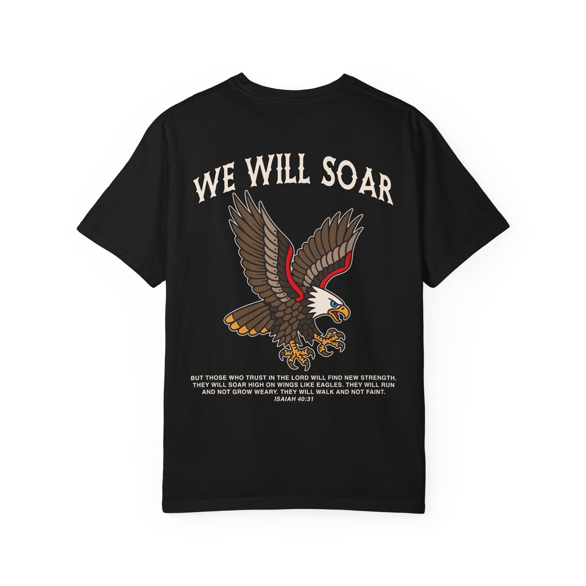 This Comfort Colors® heavyweight tee rocks an American Traditional eagle. Beneath the ink, Isaiah 40:31 reminds us that real strength doesn’t come from muscle or might, but from the Lord who lifts us higher.