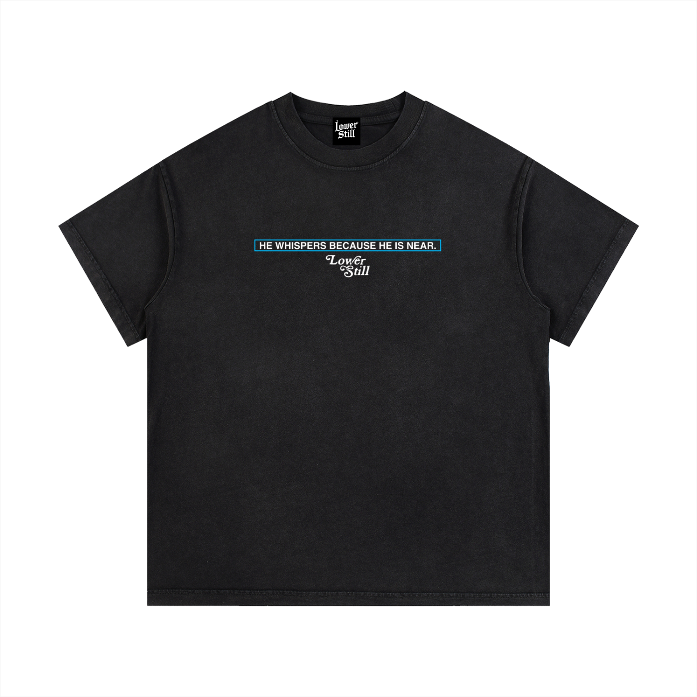 On the front, the phrase "He Whispers Because He is Near" is printed in a clean, timeless font, a wearable encouragement that God’s closeness is found in the quiet.